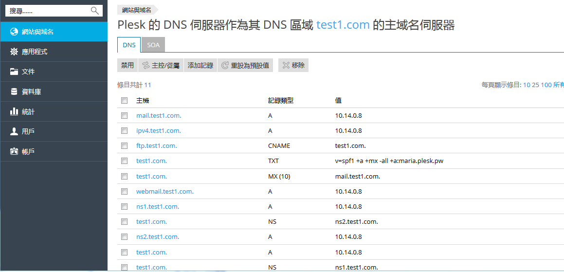 若要添加記錄,請點按 添加記錄。若要修改記錄,請按一下其名稱。若要移除記錄,請選擇記錄名稱旁邊的核取方塊並點按 移除。請注意移除某些記錄將會影響您的域名的功能運行。例如,移除 A 記錄將會阻止該記錄被解析。如果您對影響網站功能的 DNS 區域做了更改,您則可以點按 重設為預設值 來恢復預設的 DNS 記錄。這將會取消對 DNS 區域所做的所有更改並會根據伺服器範圍的 DNS 範本進行重建。注意您添加到區域的任何自訂記錄都將會丟失。