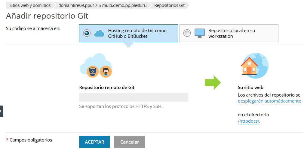 Repositorio Git en Plesk. Especifique el nombre del repositorio. Por omisión, se usa el nombre del dominio con el sufijo .git.